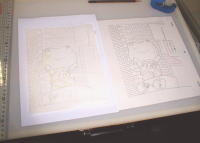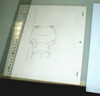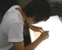 カナリ真剣ですね〜 この時に気を付けることは・・・<線が切れていたり、かすれていないか>です。後で修正することも出来ますが面倒なので、最初にキッチリ描きます。 ライティングボードは長く使っていると目がチカチカしてきました。 |
